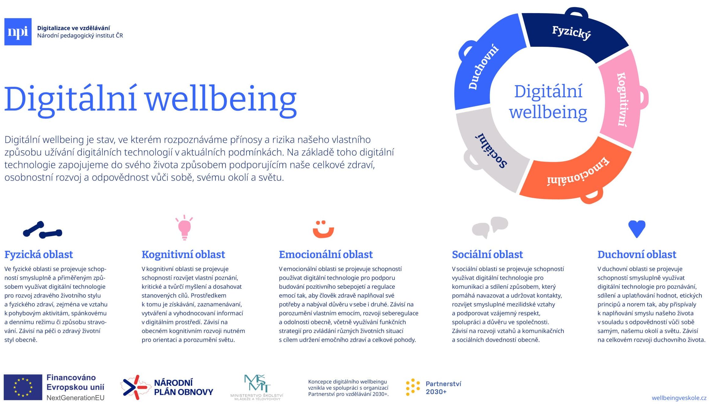 Podstránka Digitální wellbeing na portáli Digitalizace ve vzdělávání (Národní pedagogický institut ČR) ponúka prehľadne spracované informácie na podporu zdravého a uvedomelého používania digitálnych technológií vo vzdelávaní.